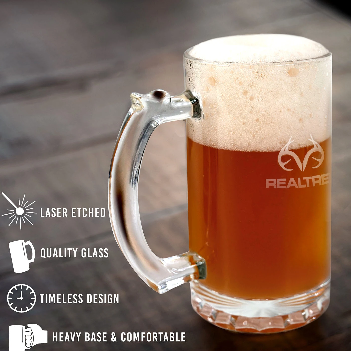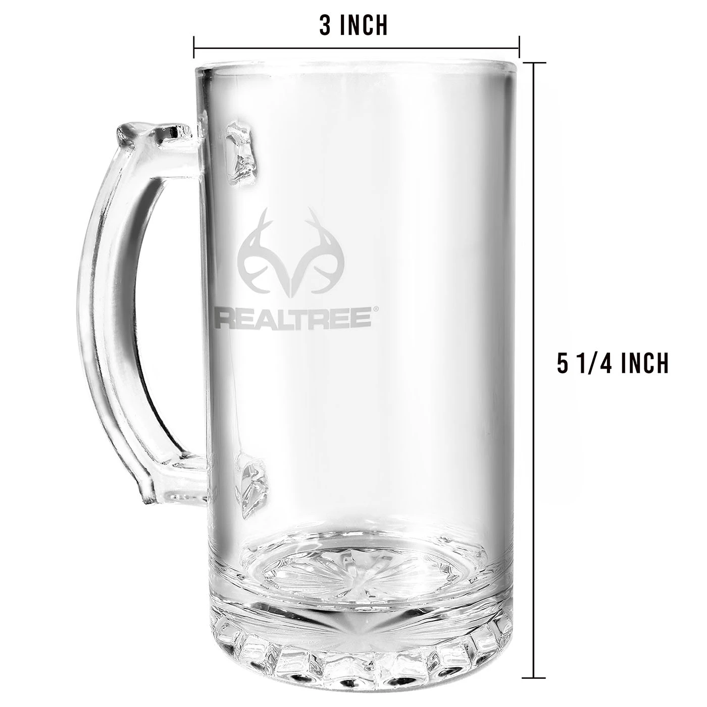 Product Details: Set of 4 Beer Mug Glasses by Realtree. Holds 16oz of liquid with a total dimension of 5.25” tall x 3” wide opening. Each glass is laser etched with the Realtree logo, one of America’s favorite outdoorsman brands.