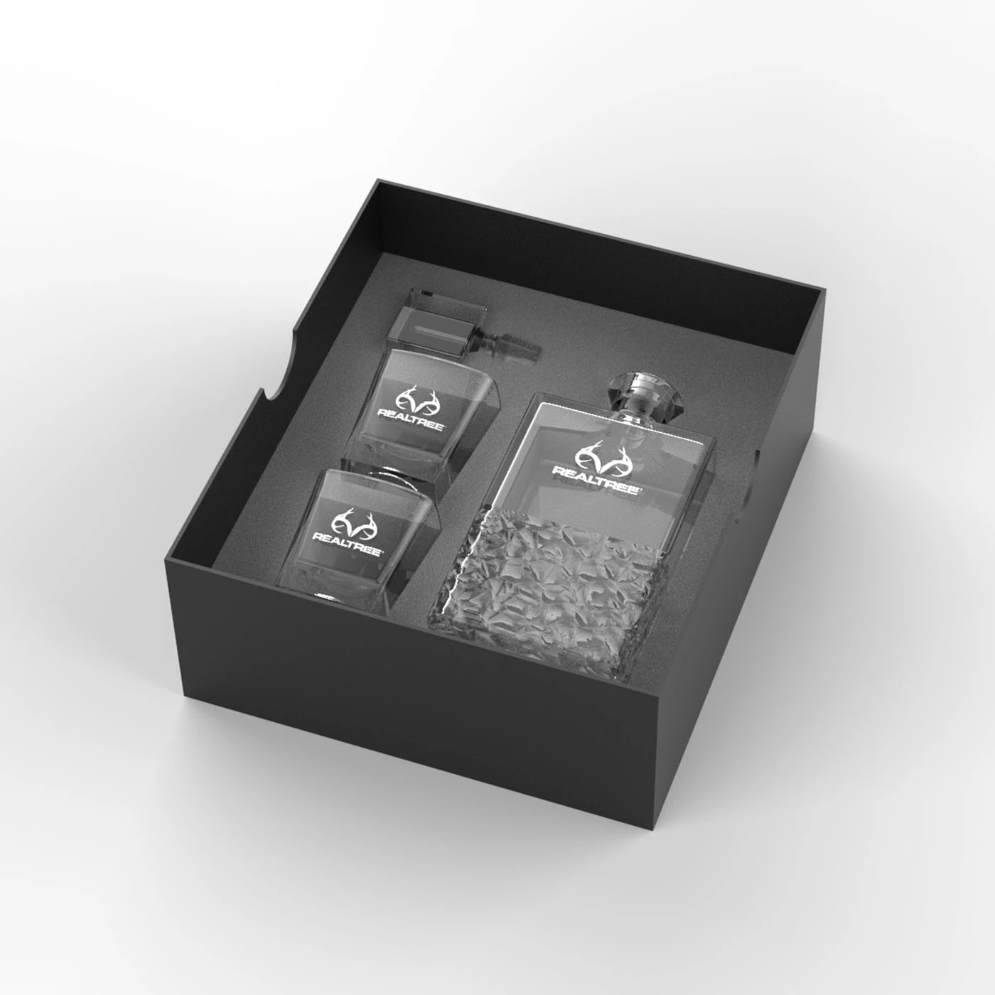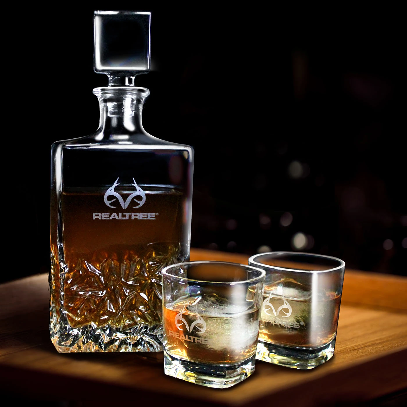 This Whiskey Decanter Set is a stunning addition to any bar! The eye catching, diamond cut design of the Decanter and the laser etched glasses are sure to impress any guests. Whether for the beginning of the night or an extended nightcap, this set is perfect for any occasion.