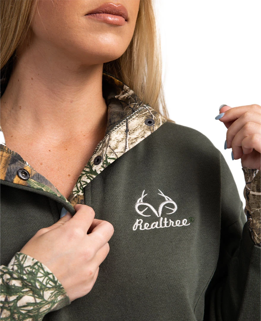 Featuring a convenient ¼ snap button closure, this pullover offers versatility in wearing options and easy on/off access. The storm cuffs help to keep the cold air out, ensuring warmth and comfort. The mid-weight construction strikes the perfect balance between insulation and breathability, making it suitable for a variety of weather conditions. The long sleeves and curved hemline add a stylish touch to the design, while the two side passthrough pockets provide ample storage and hand warmth. Crafted from a super soft and cozy fleece blend of 70% cotton and 30% polyester, this pullover guarantees a comfortable and plush feel against your skin. It can be easily cared for by machine washing it on a cold, gentle cycle with like colors. Elevate your outdoor wardrobe with the Realtree Women’s Aspen ¼ Snap Fleece Pullover, a perfect blend of style, comfort, and functionality.