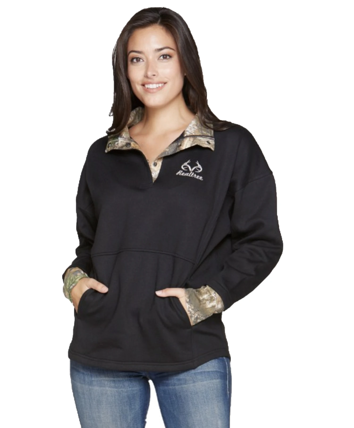 The Realtree Women’s Aspen ¼ Snap Fleece Pullover is the perfect combination of comfort, style, and functionality. This pullover is designed with an oversized fit, allowing you to enjoy a relaxed and cozy feel. Available in black or green, the body of the pullover is complemented by Realtree Edge accents, adding a touch of outdoor-inspired charm.